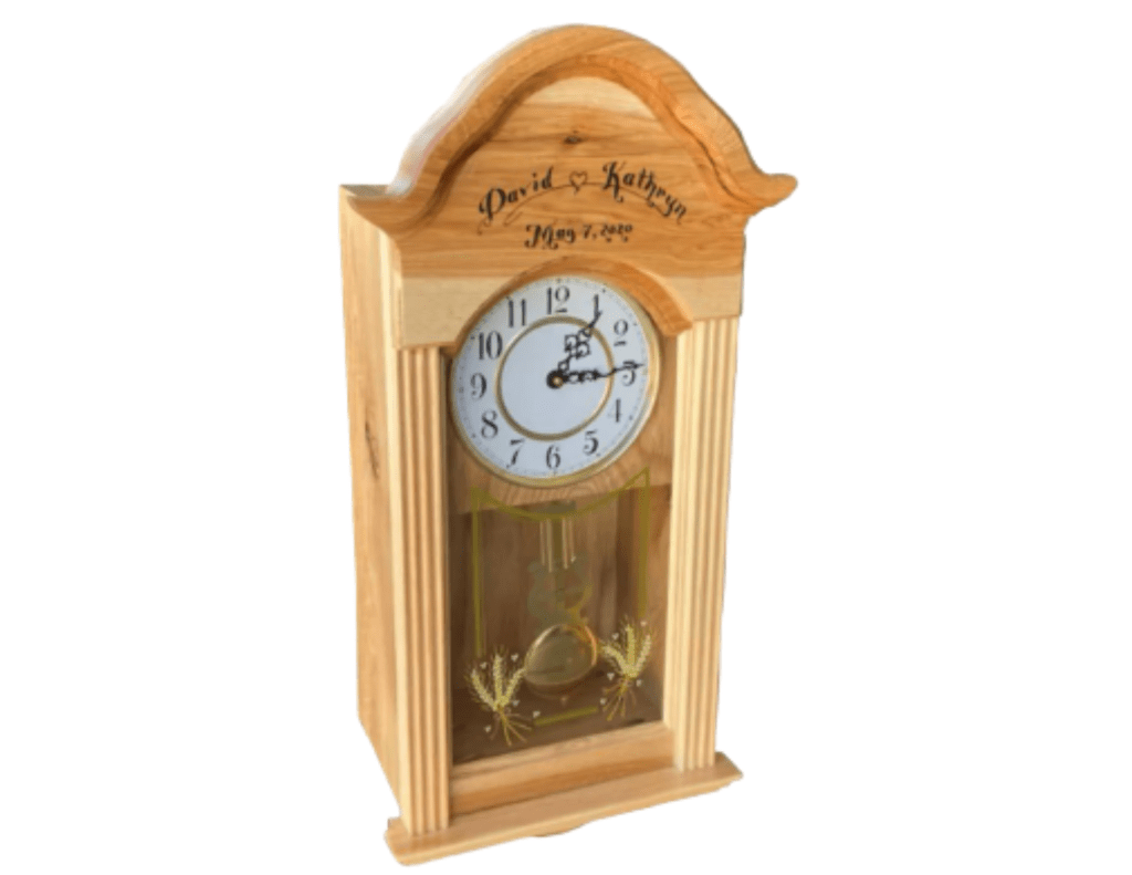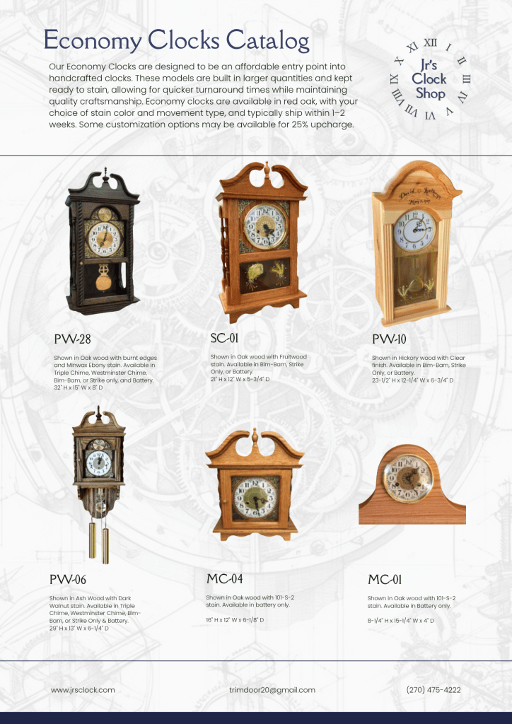 Economy Clocks are our most accessible starting point. These designs are built in larger quantities and kept ready to finish, which allows us to offer a well‑crafted clock at a lower price point. While they don’t offer the full range of customization found in our other models, you can still choose your stain color and movement type. Economy clocks are built from red oak and typically ship within 1–2 weeks.