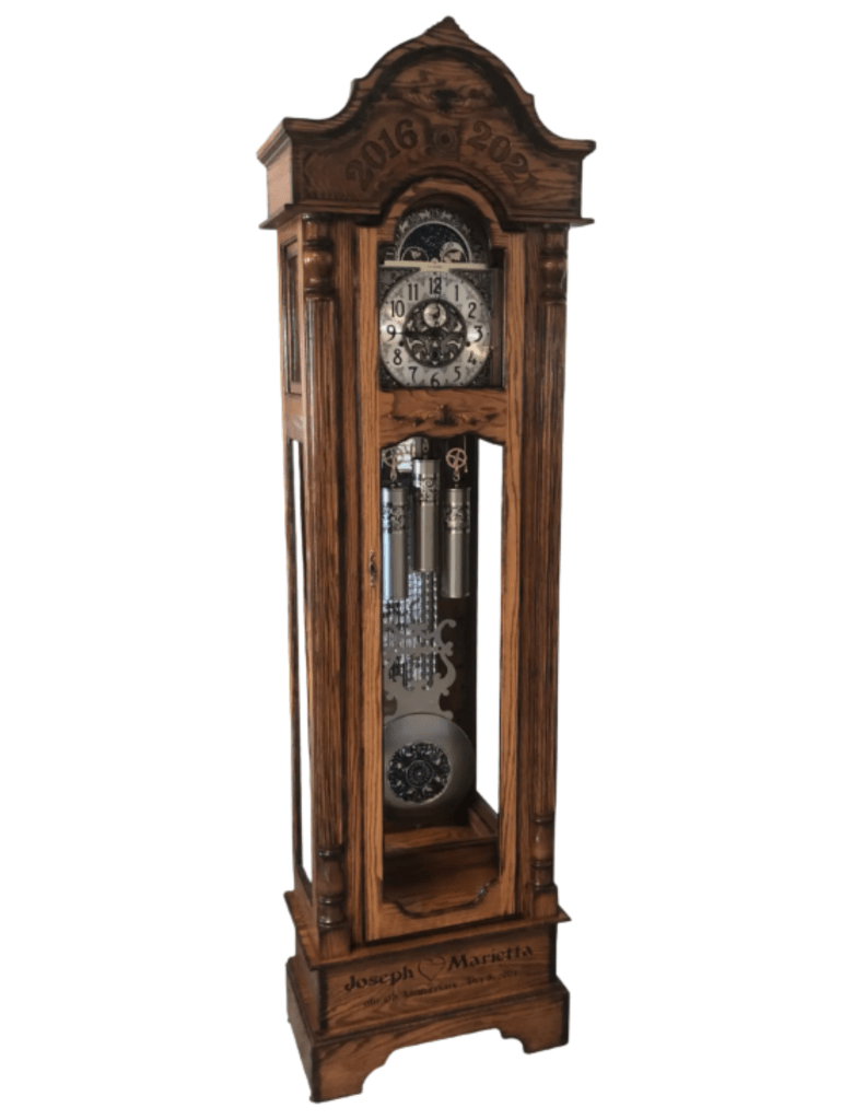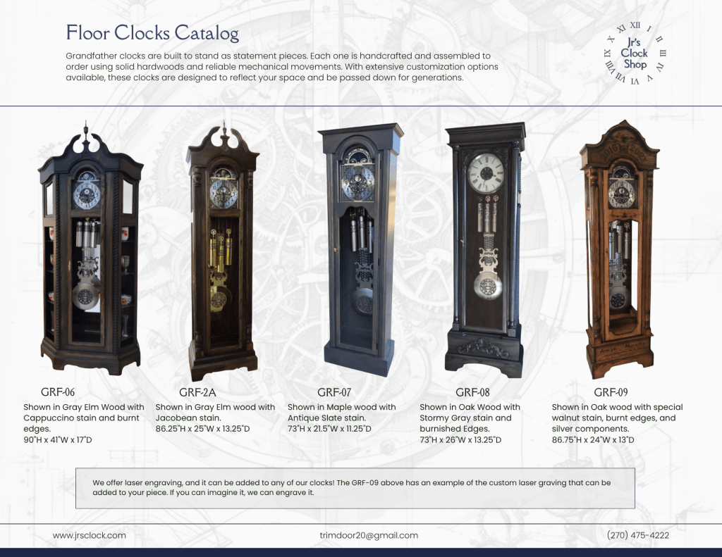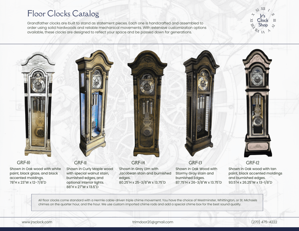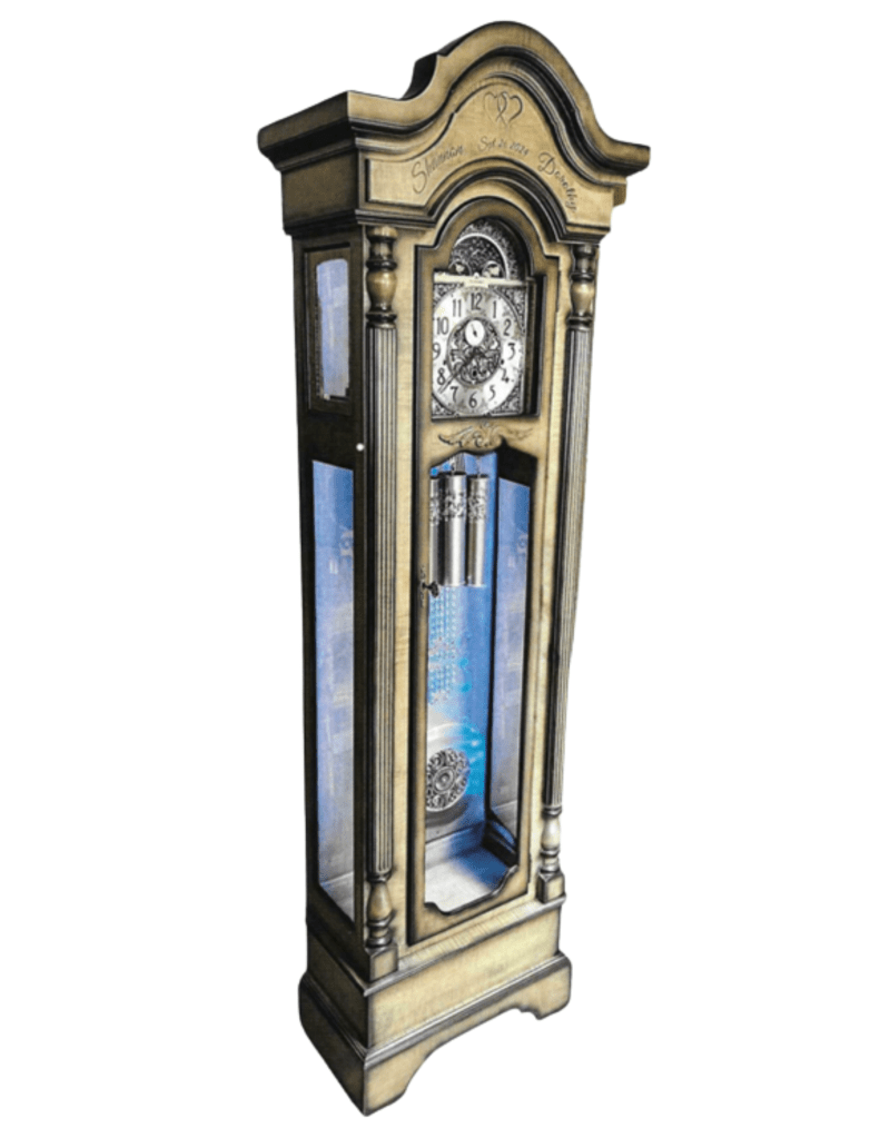 Because of their size and detail, grandfather clocks offer the greatest opportunity for customization. Customers can select wood species, finishes, movement options, and design details to create a clock that reflects their space and personal style. Whether traditional or more contemporary, these clocks are built with longevity in mind and designed to be passed down for generations.
