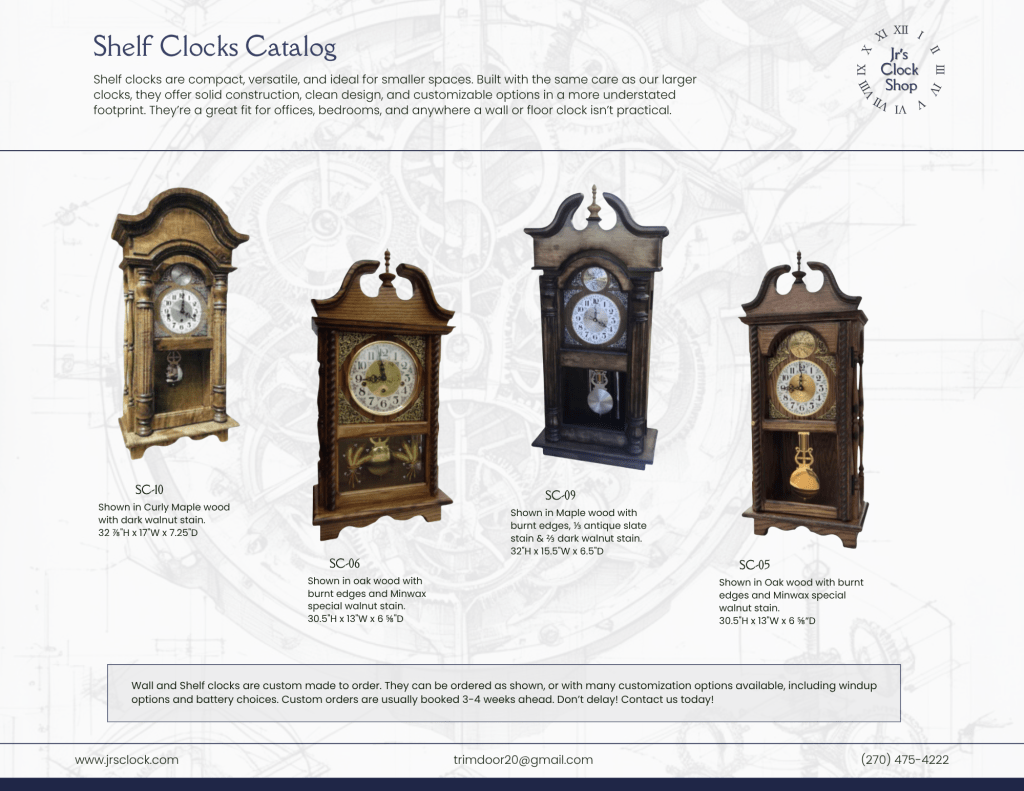 Shelf clocks are available in several styles and can be customized with different woods, finishes, and movement options. They’re a great choice for offices, bedrooms, or anywhere you want a handcrafted piece without making a large visual statement.
